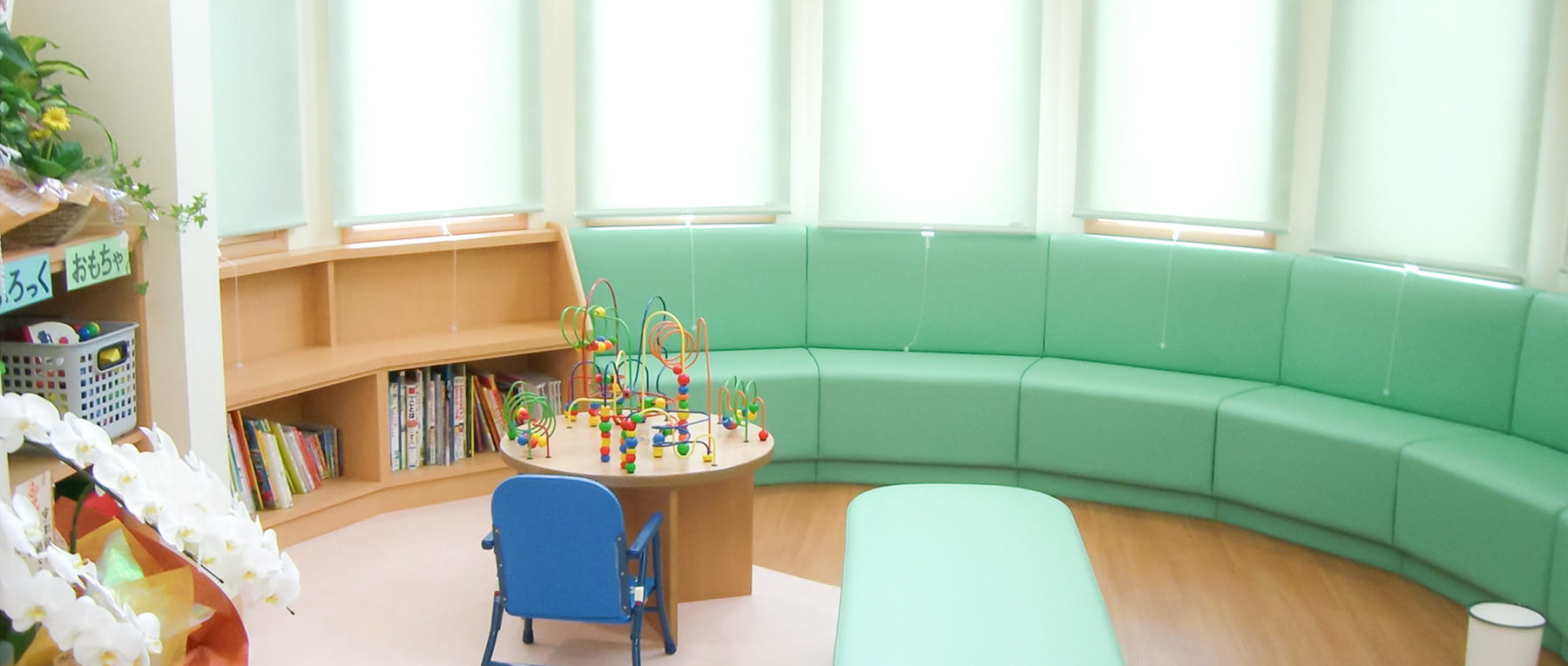 幼児や小児のための待合室のキッズコーナーは、絵本やブロックなどを揃え、お子さんの待ち時間解消に役立っております。